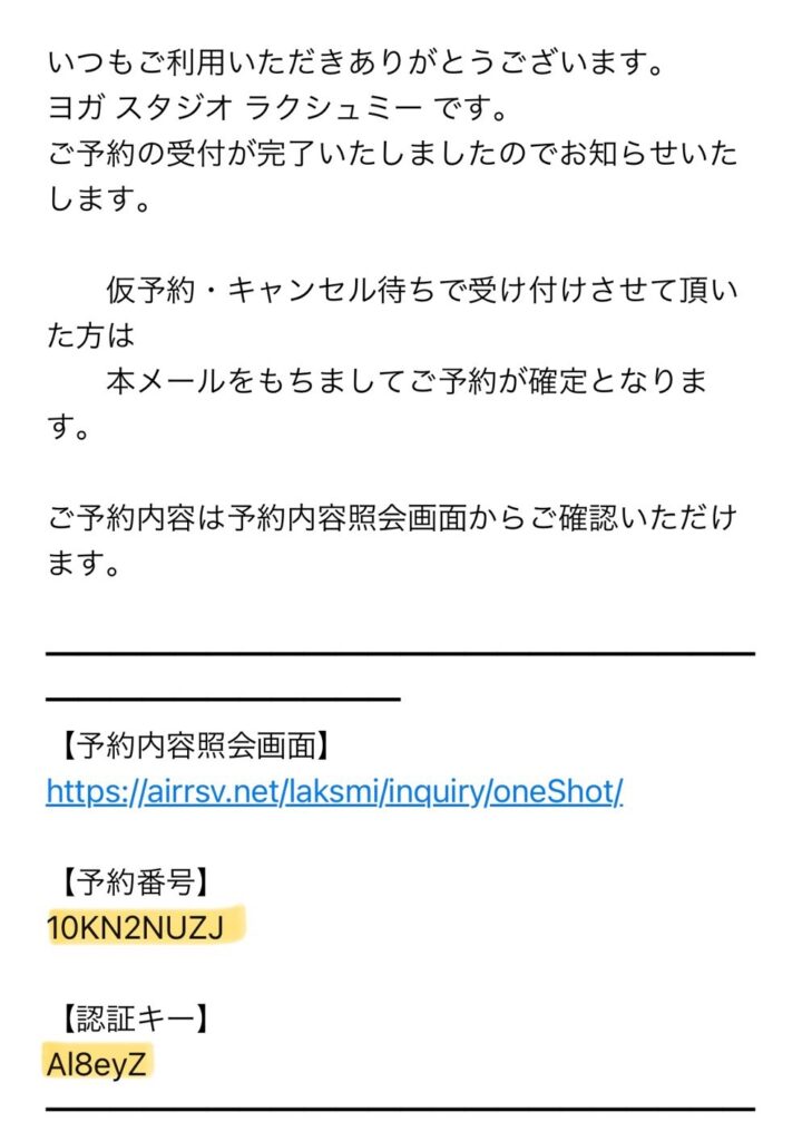 そのメールには、万一都合が悪くなった場合にキャンセルするために必要な「予約照会画面のURL」「予約番号」「認証キー」が記載されております。↓(一部抜粋)